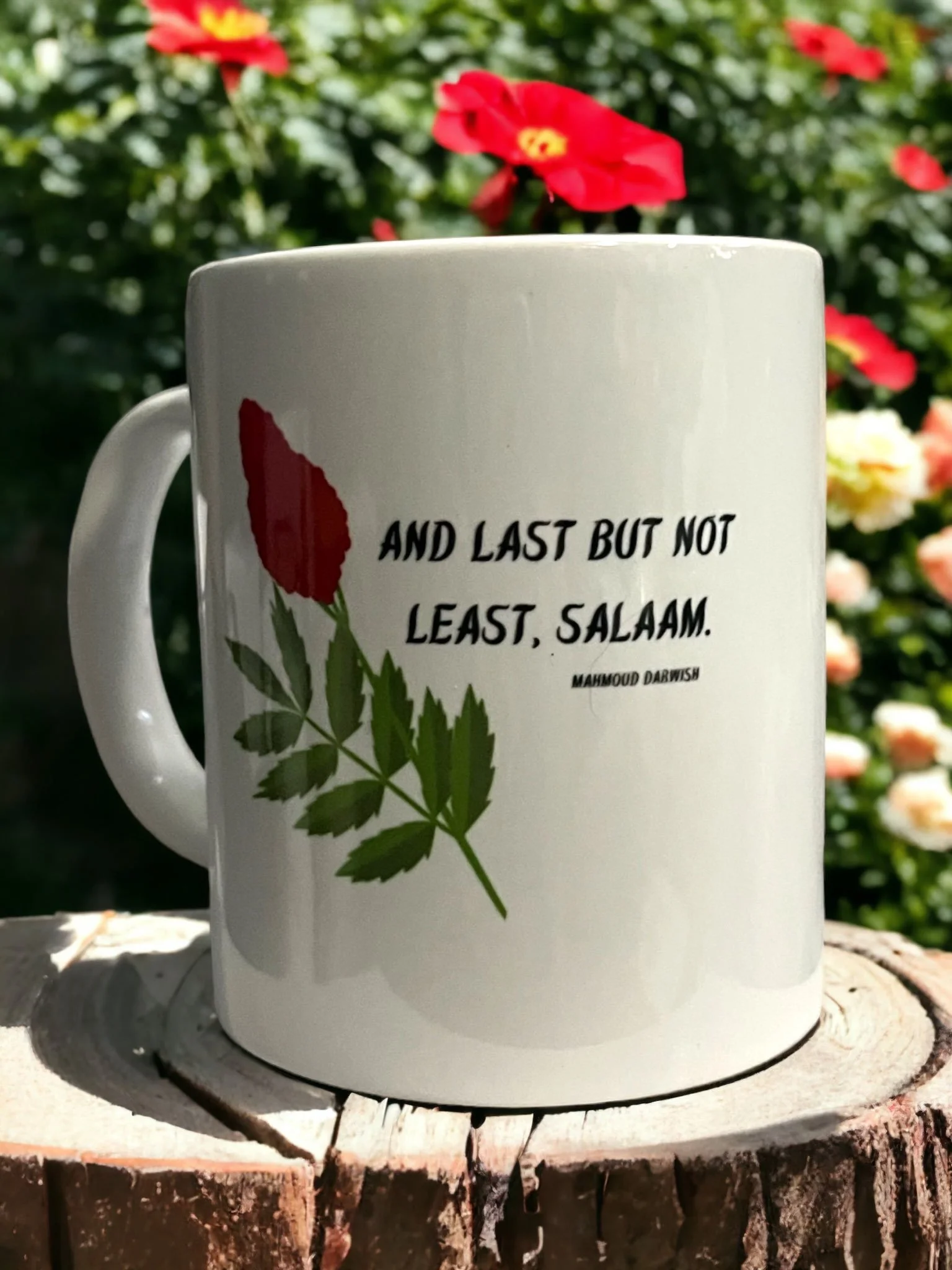 The mug includes the closing line from Mahmoud Darwish’s poem “To a Young Poet” as translated by Fadi Joudah—"And last but not least, Salaam"—alongside an image of sumac leaves and flowers.