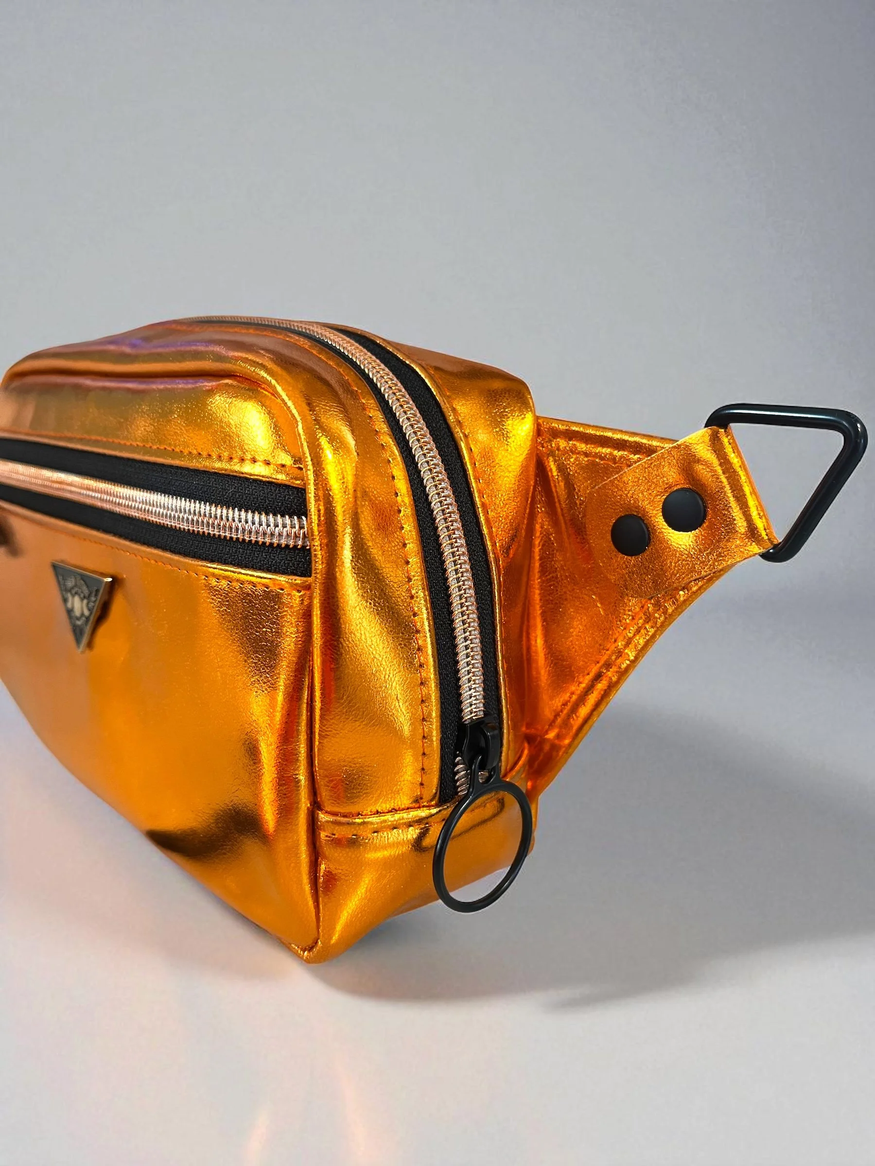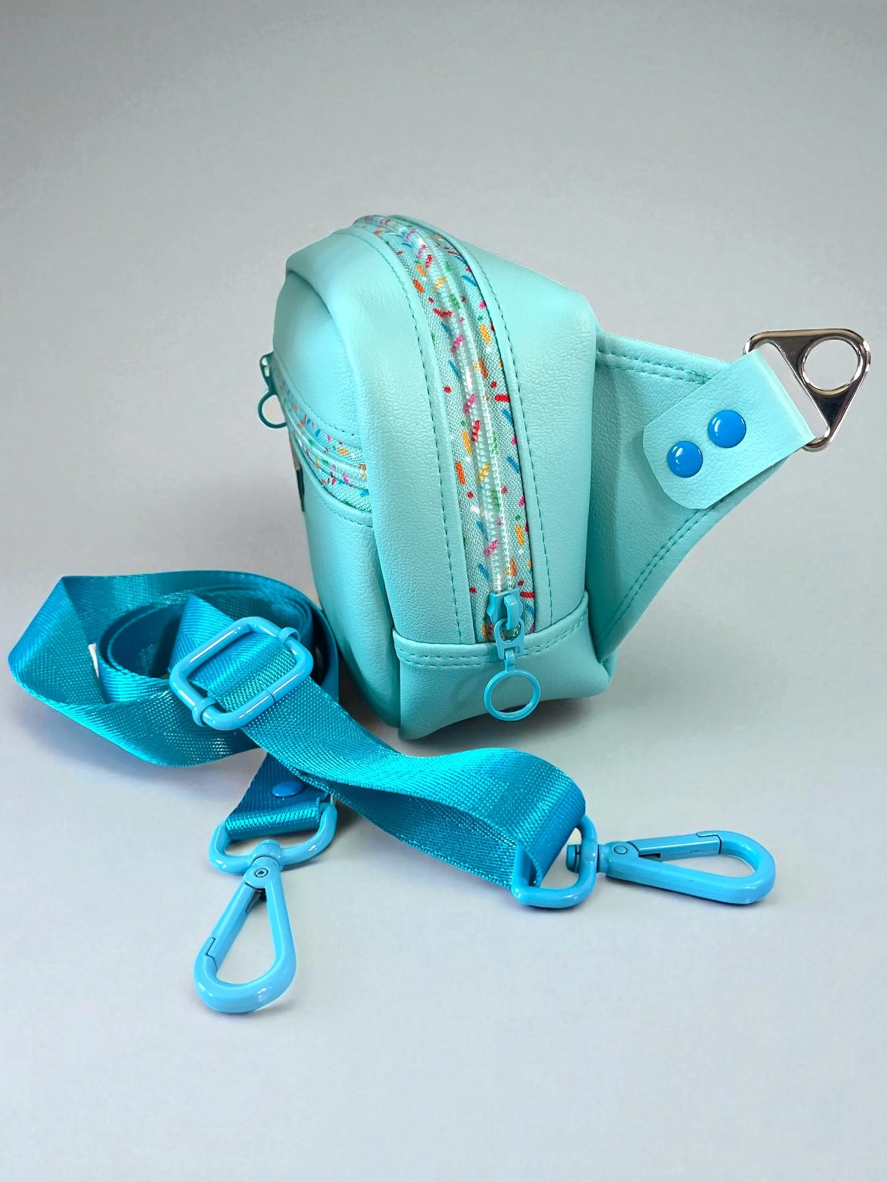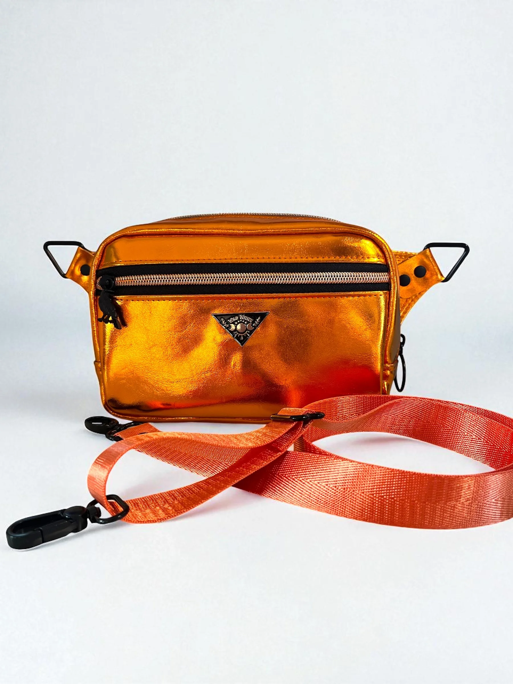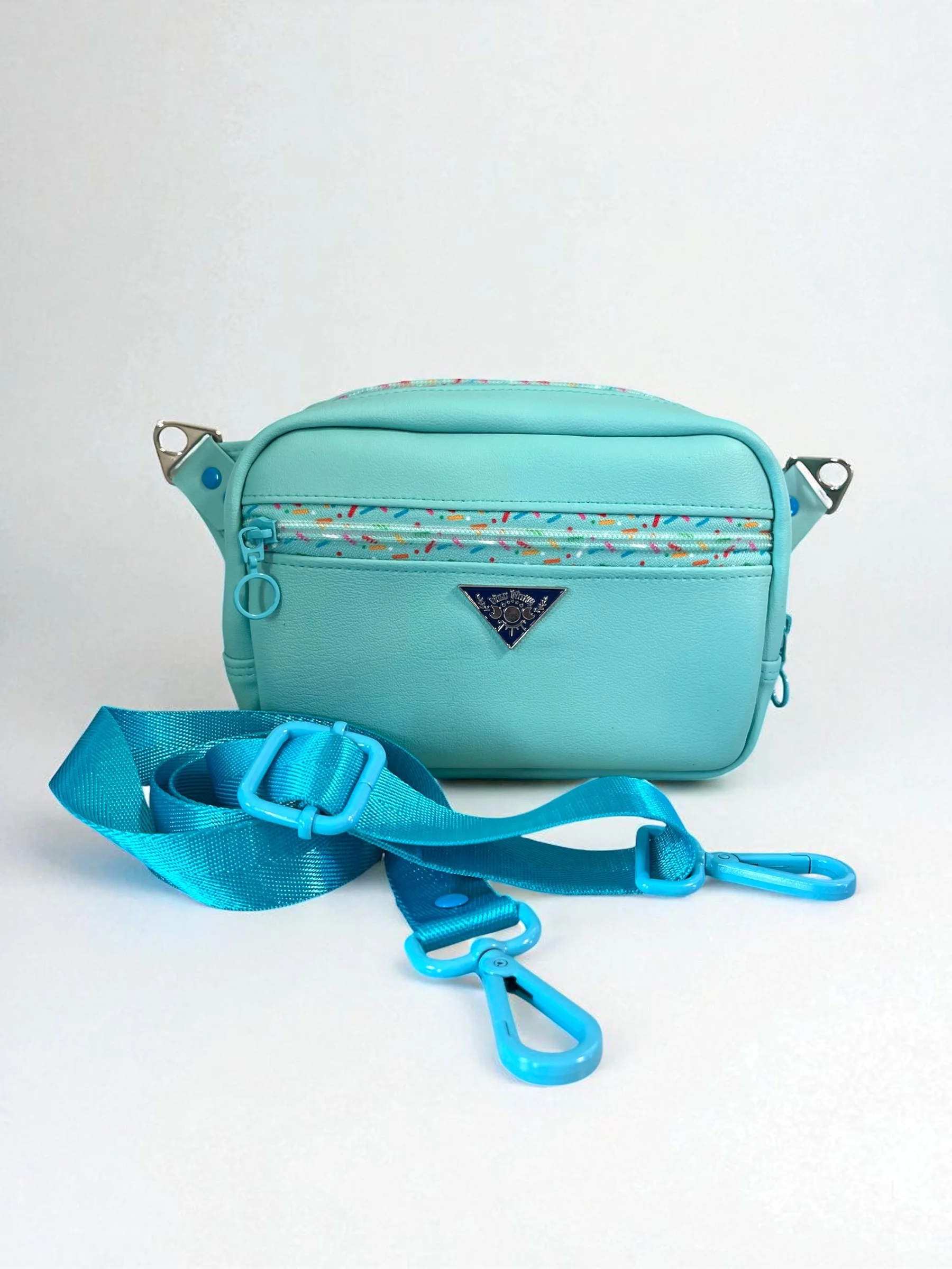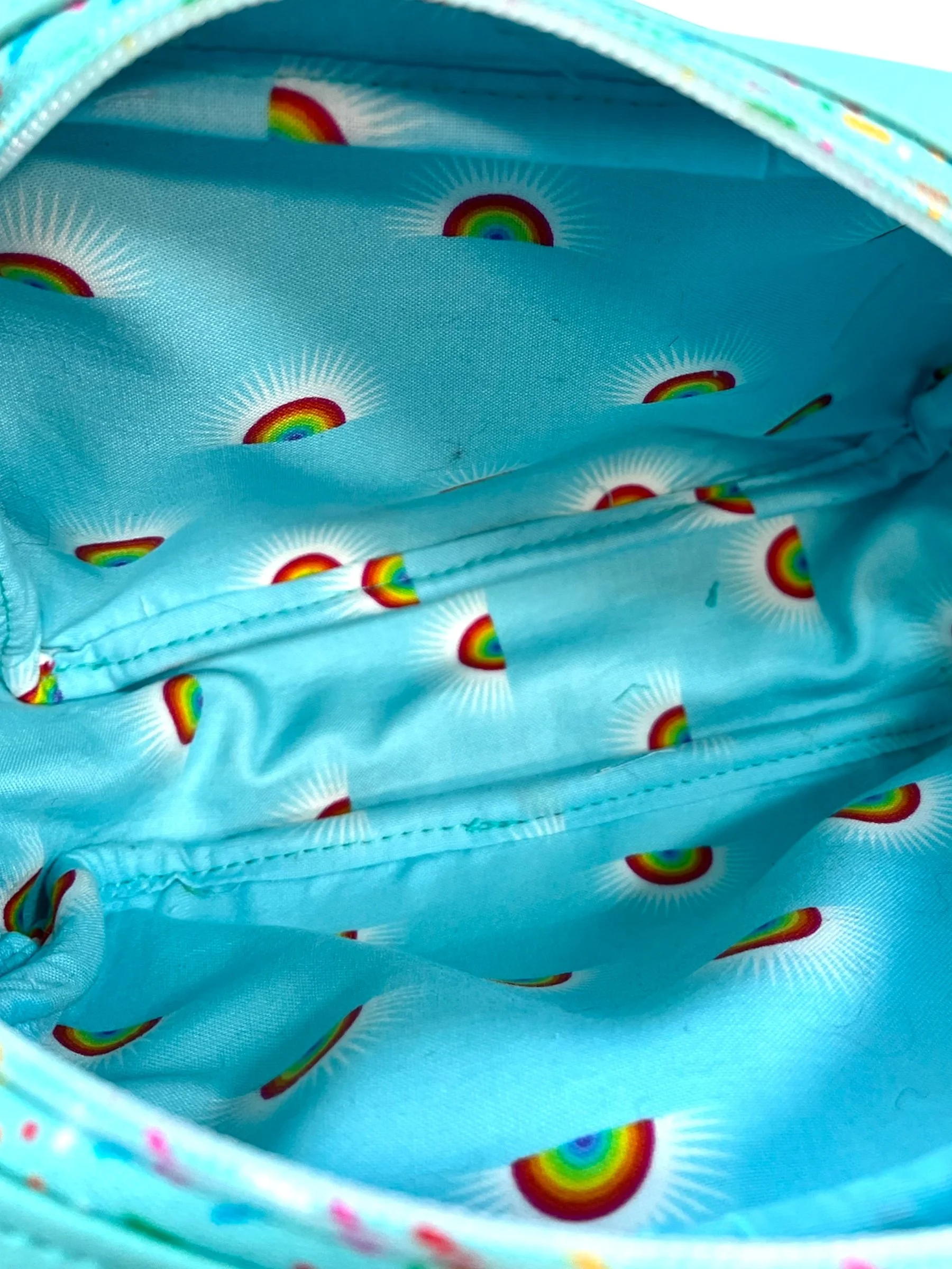 Finished bag is roughly 7½” wide by 5½”h by 2” deep. (D ring to d ring it is 12½ wide.). This bag has 1 main compartment  and one exterior zippered pocket.