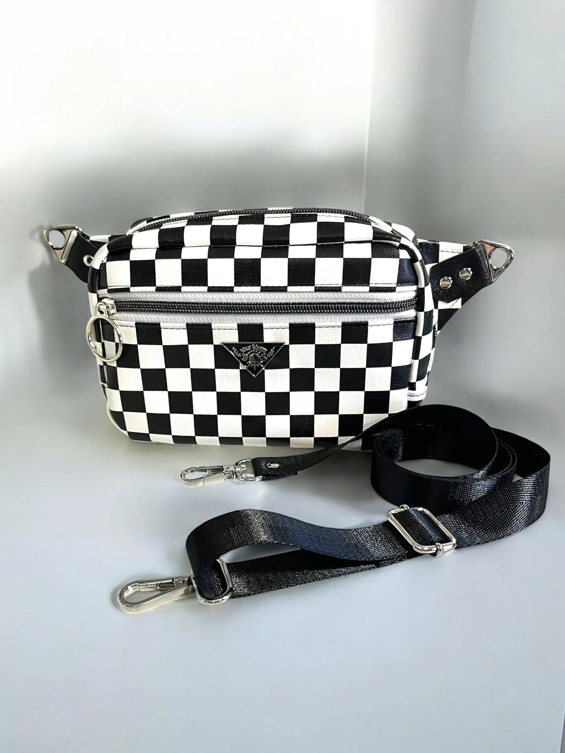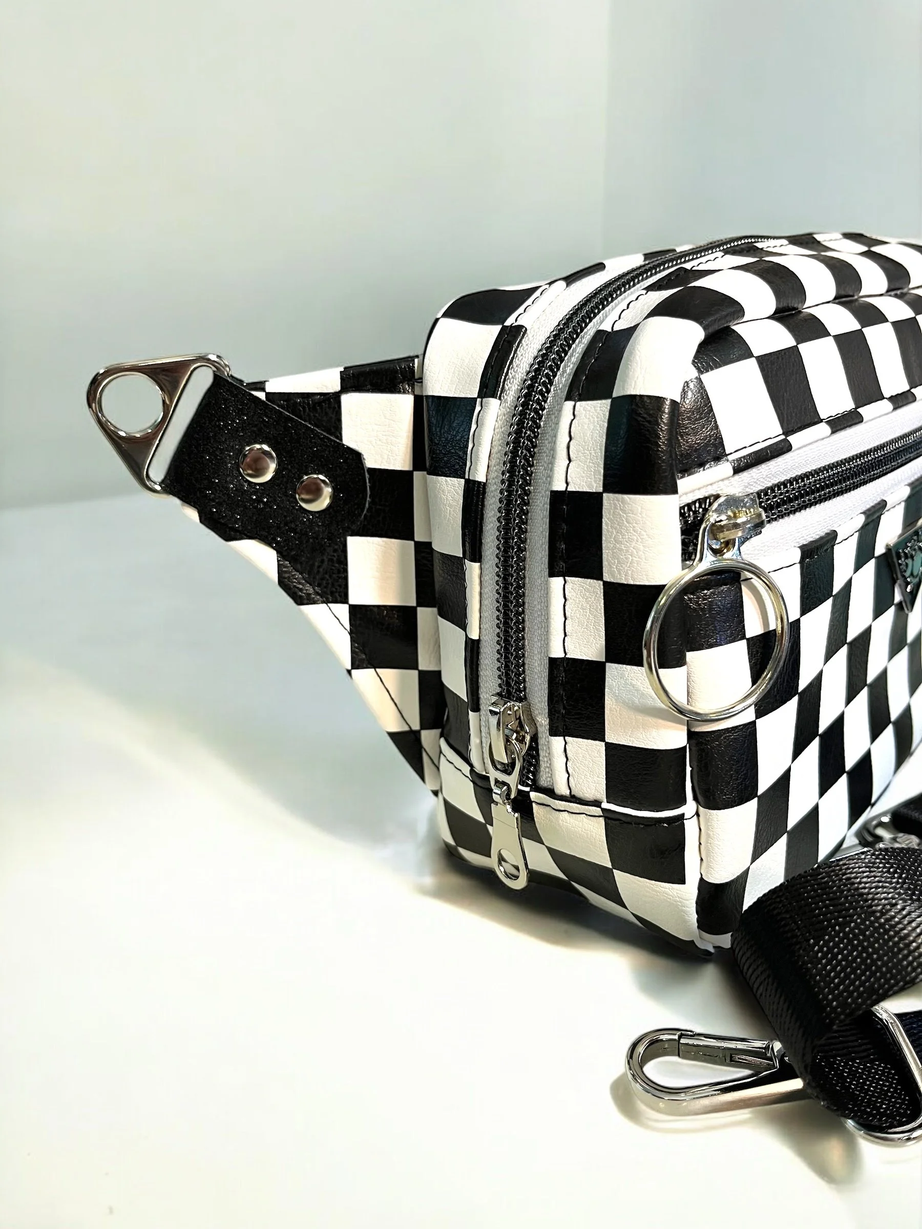 Finished bag is roughly 7½” wide by 5½”h by 2” deep. (D ring to d ring it is 12½ wide.). This bag has 1 main compartment  and one exterior zippered pocket.