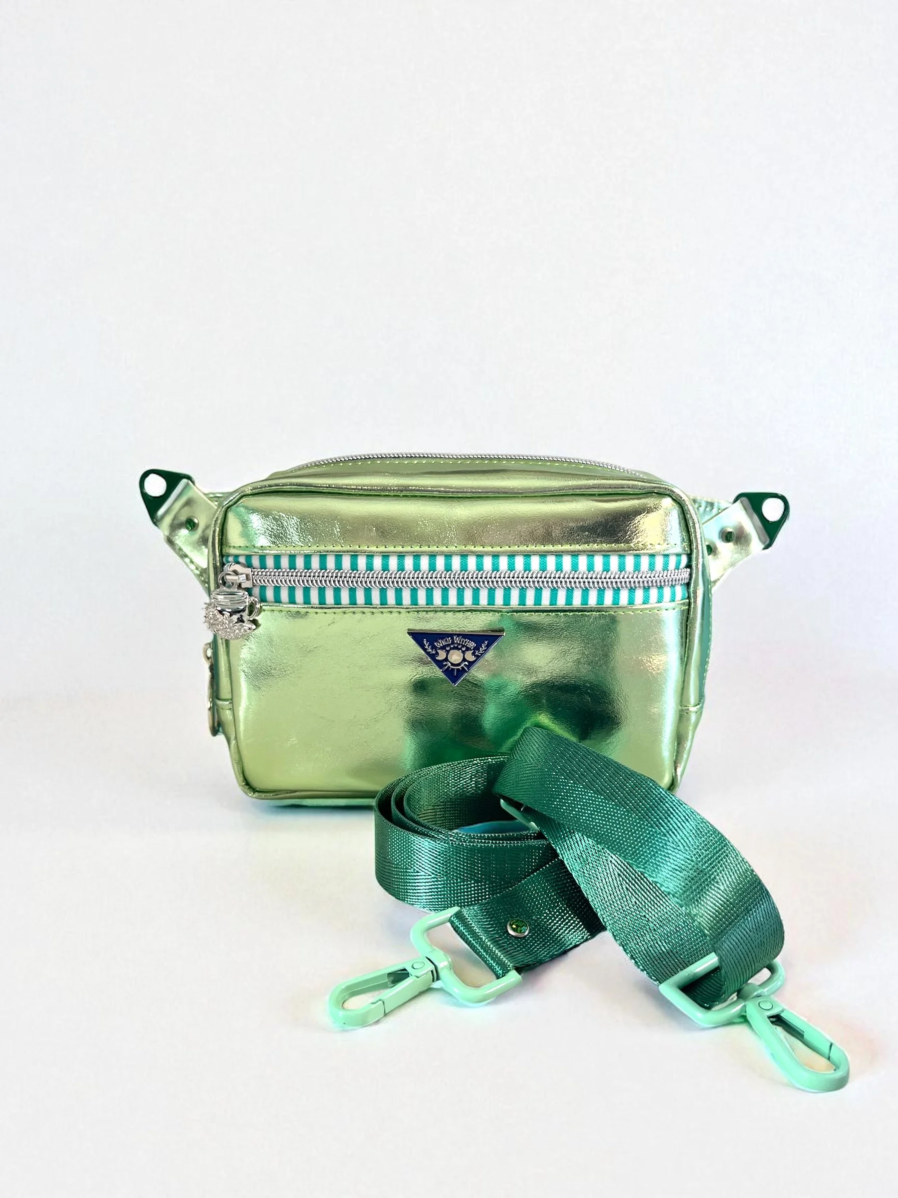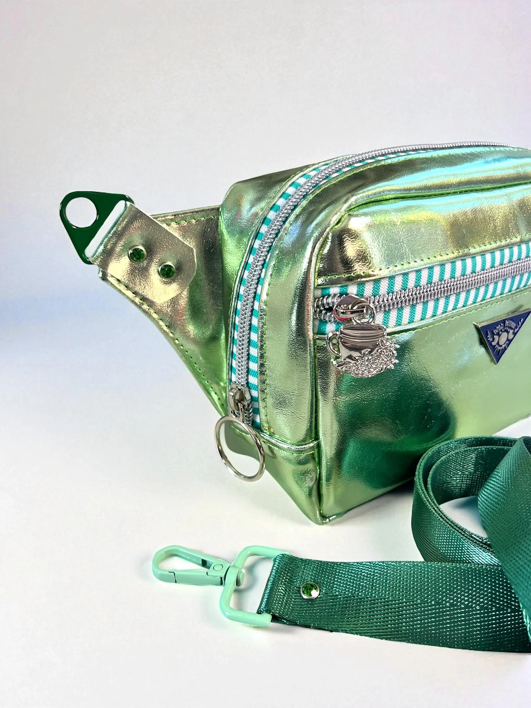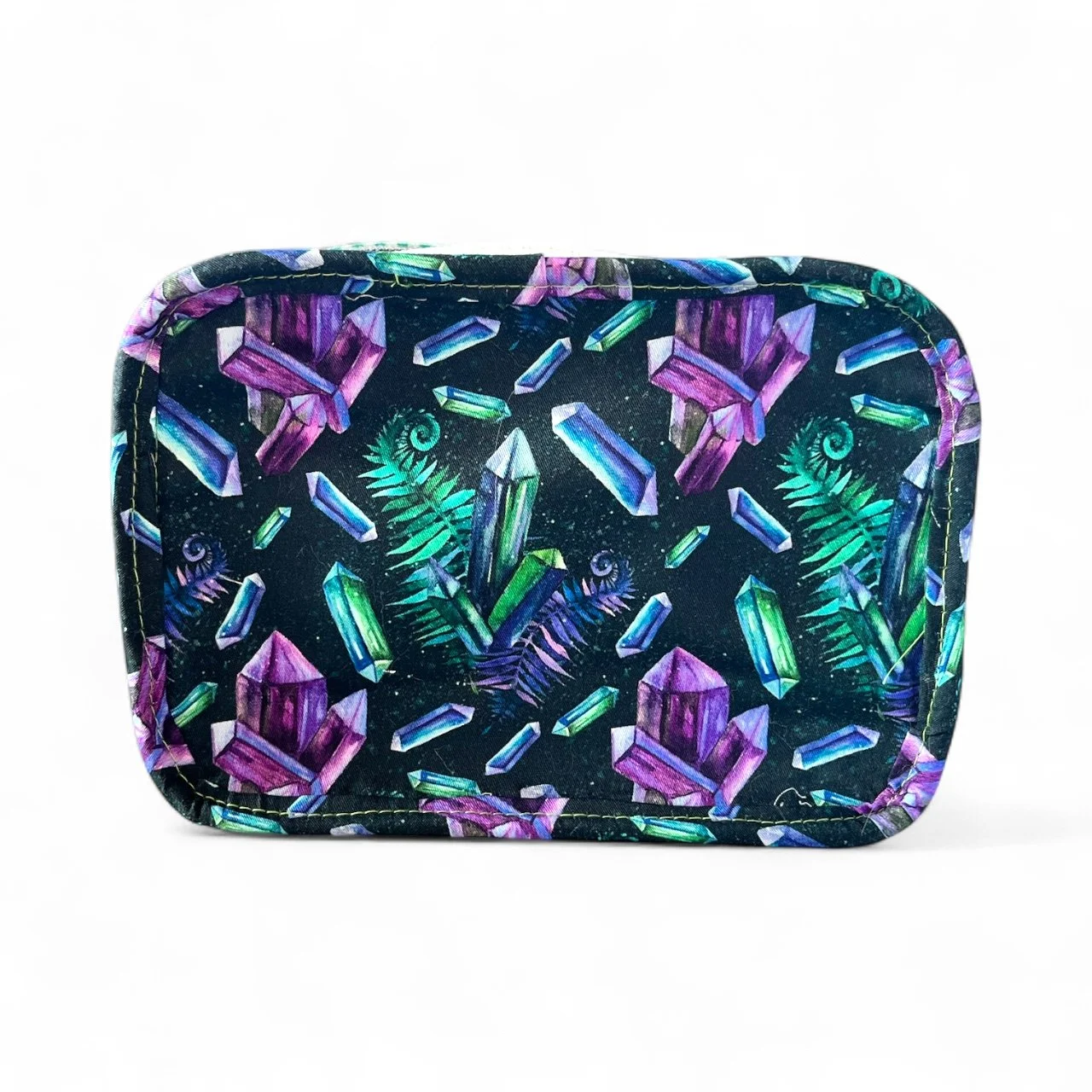 Finished bag is roughly 7½” wide by 5½”h by 2” deep. (D ring to d ring it is 12½ wide.). This bag has 1 main compartment  and one exterior zippered pocket.